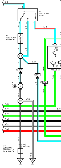 Once the Fuel Pump Resistor Relay has power to pin 3 it will by default send power to pin 4 through the Fuel Pump Resistor then to splice point E2 then on to the pump. This will make the pump run at slow speed.